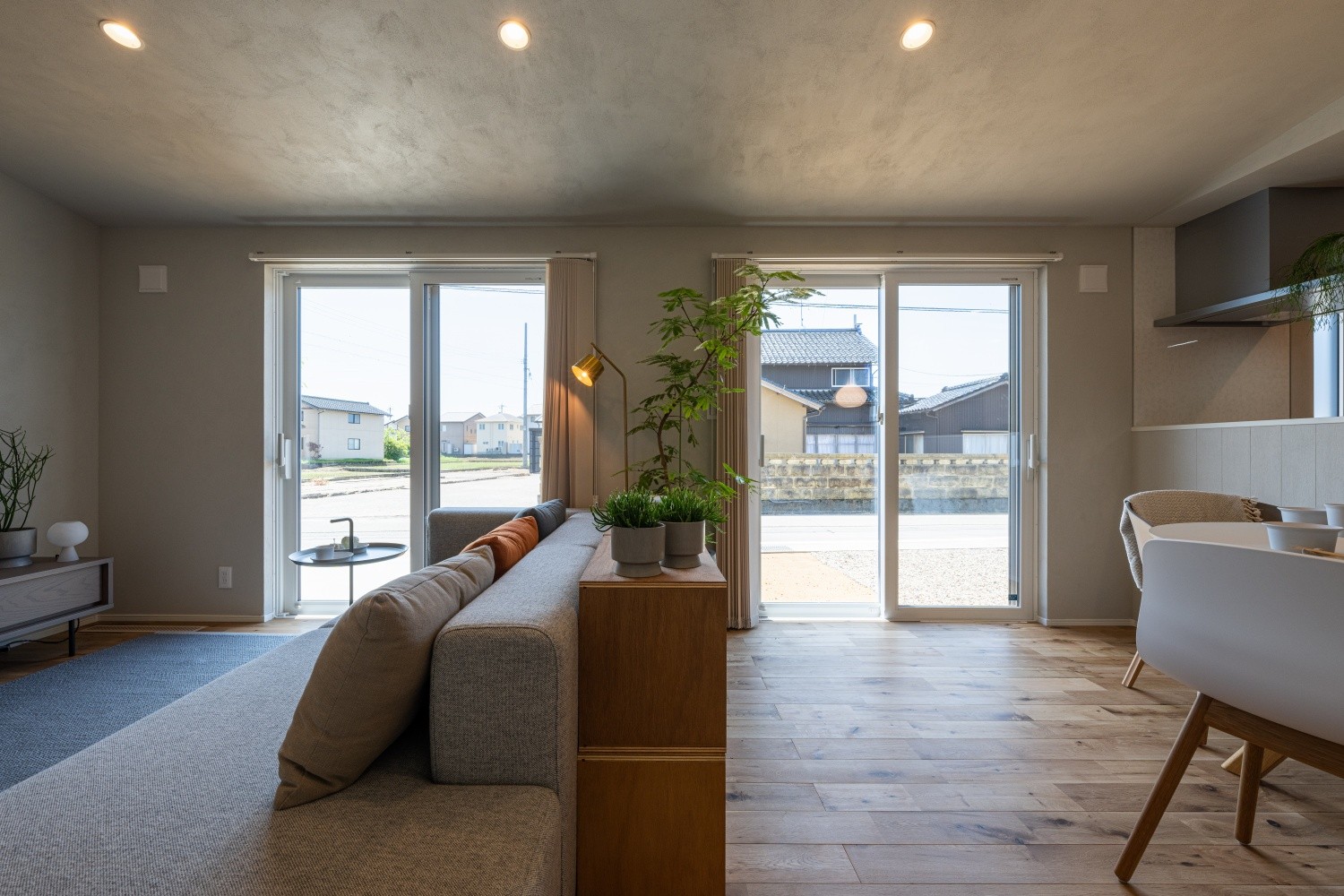 壁と天井にはグレーの塗り壁を採用。日中の自然光が生み出す陰影が、空間に豊かな表情と落ち着いた雰囲気をもたらします。
