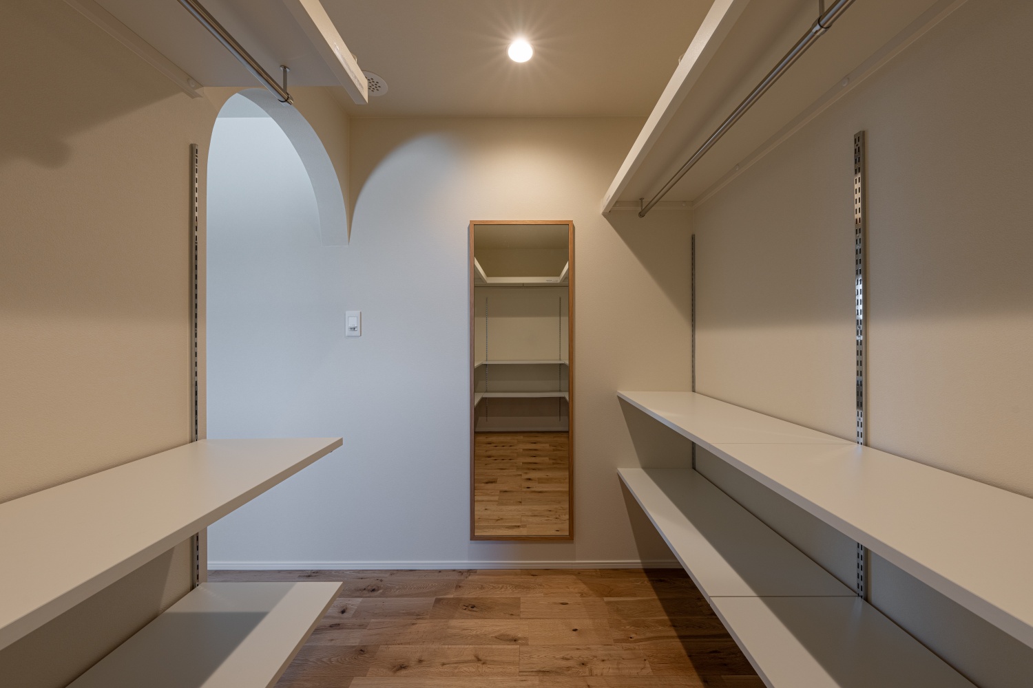 アーチの入口が印象的なウォークインクローク。機能性とデザイン性を兼ね備えた、こだわりの空間です。