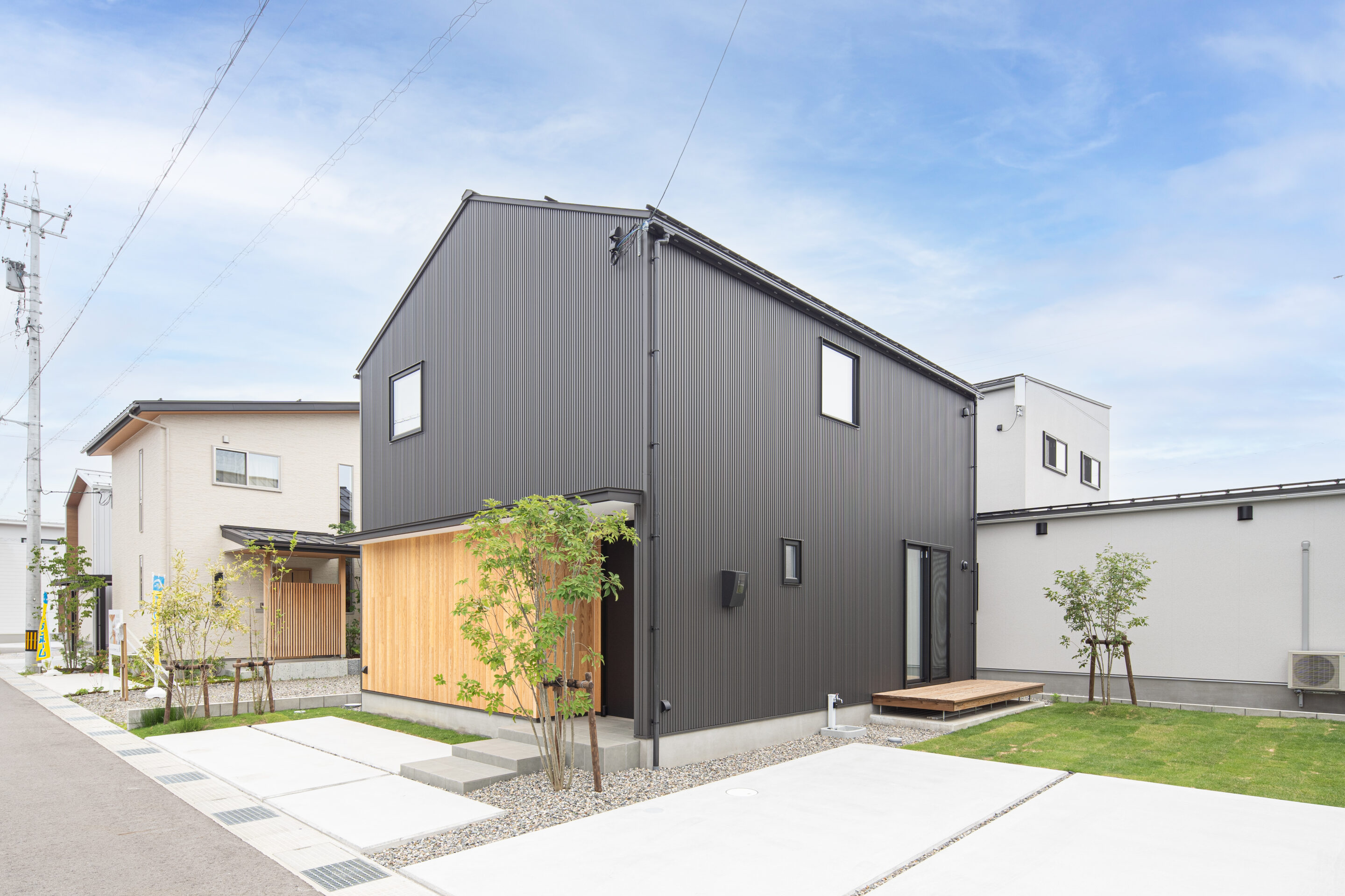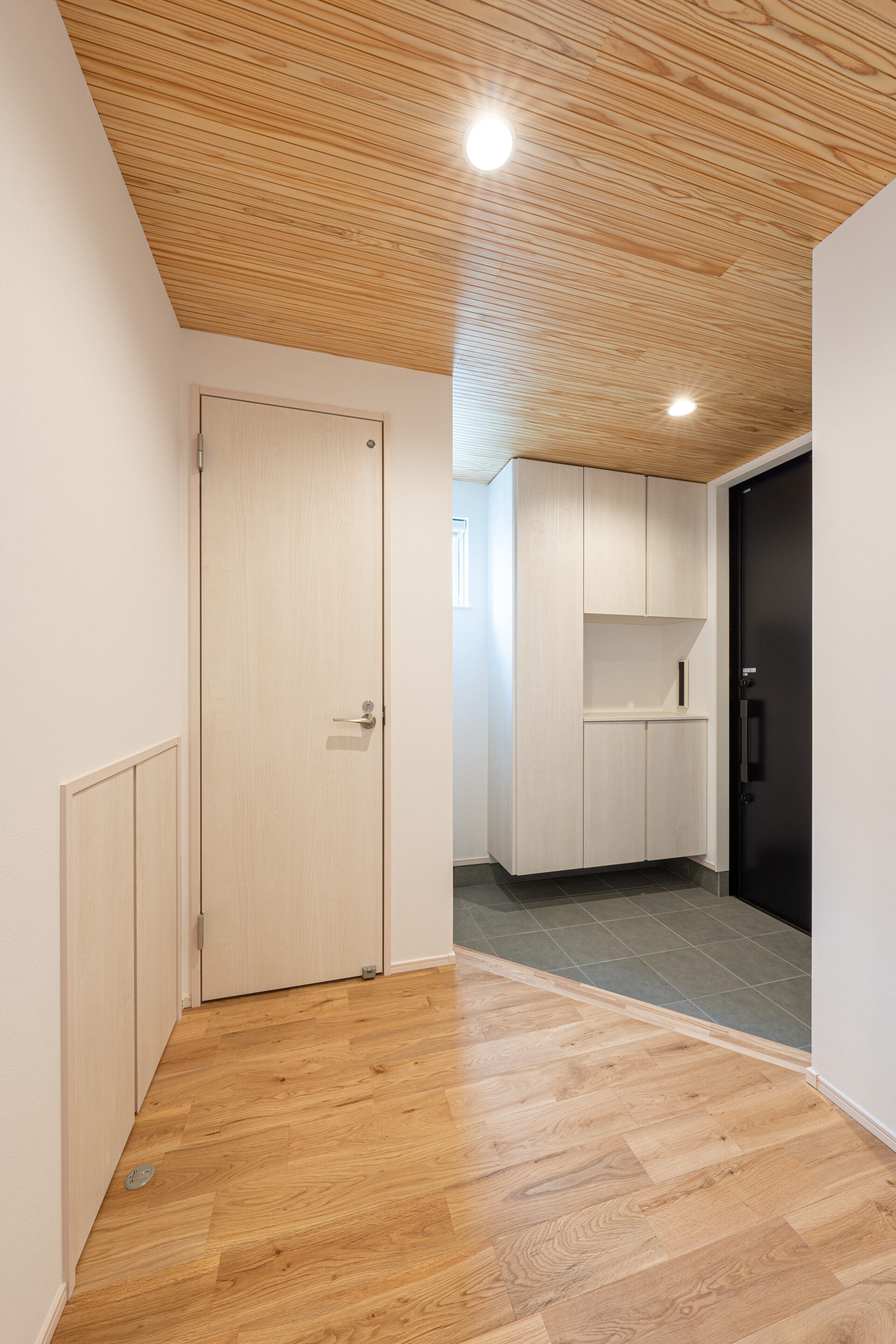 玄関の天井に施したスギ材の羽目板が、家に入った瞬間から木のぬくもりと落ち着きを感じさせます。
