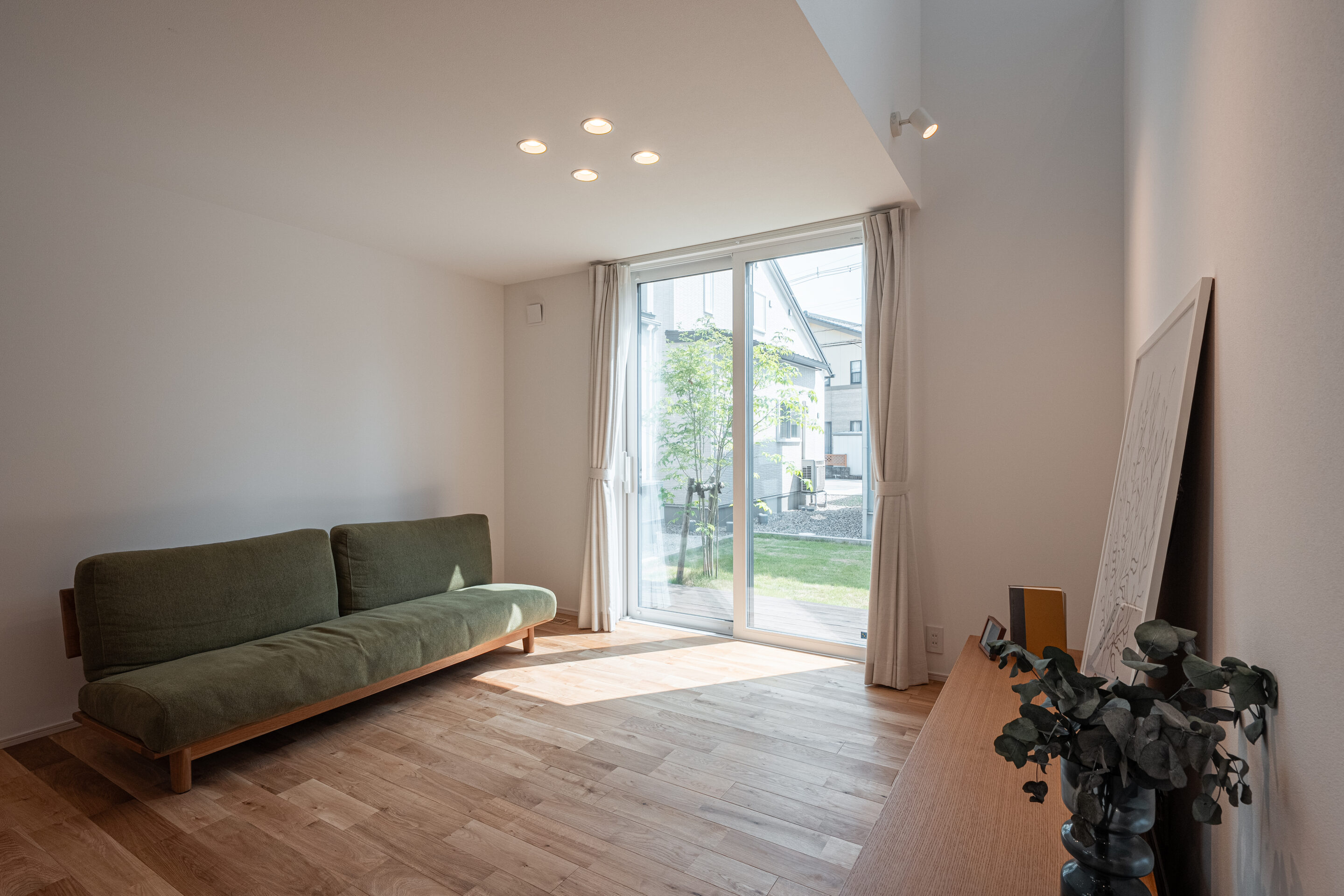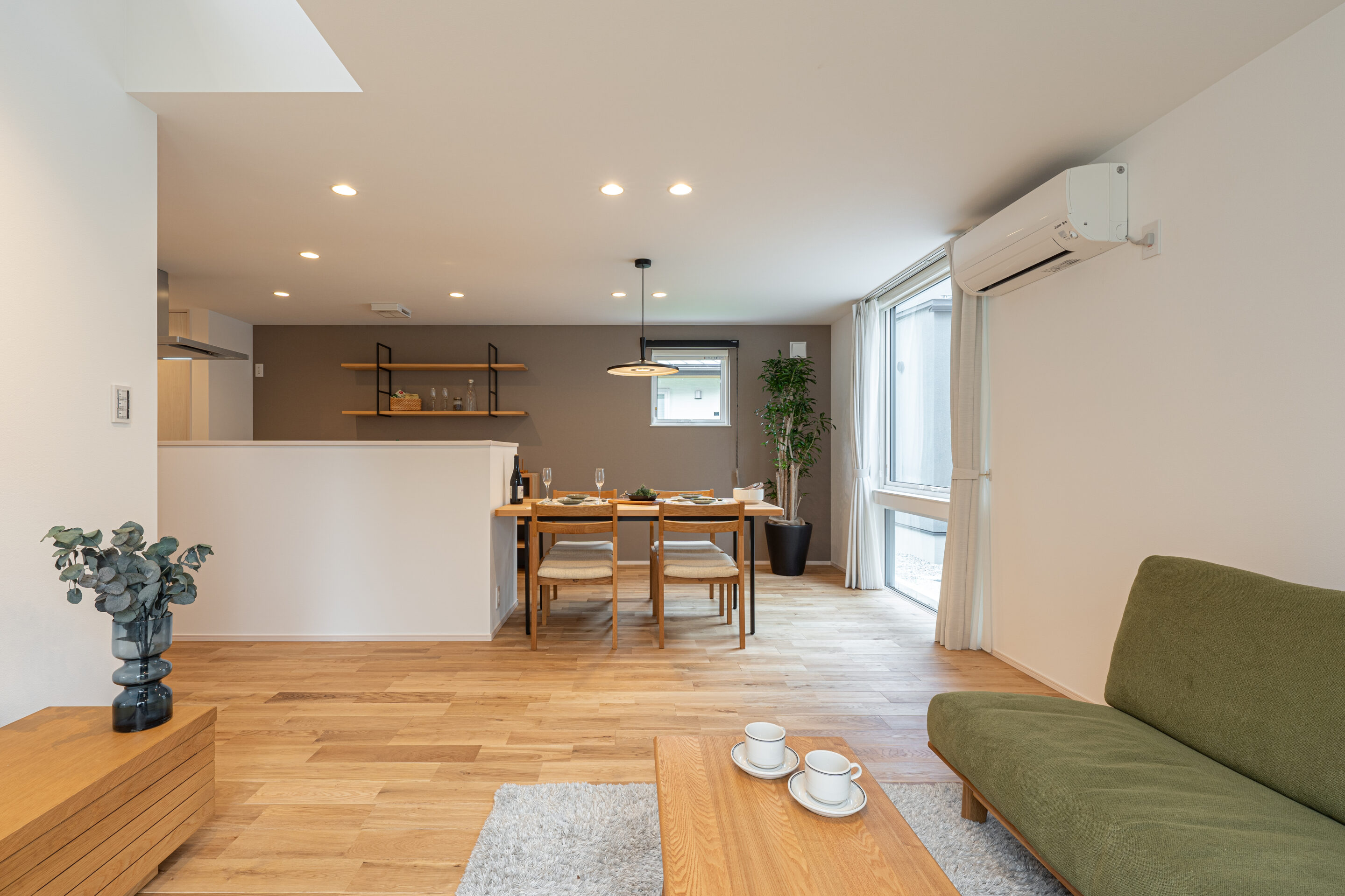 ウッドデッキとつながるリビングには、南からの光がたっぷりと差し込み、明るく開放的な空間が広がります。