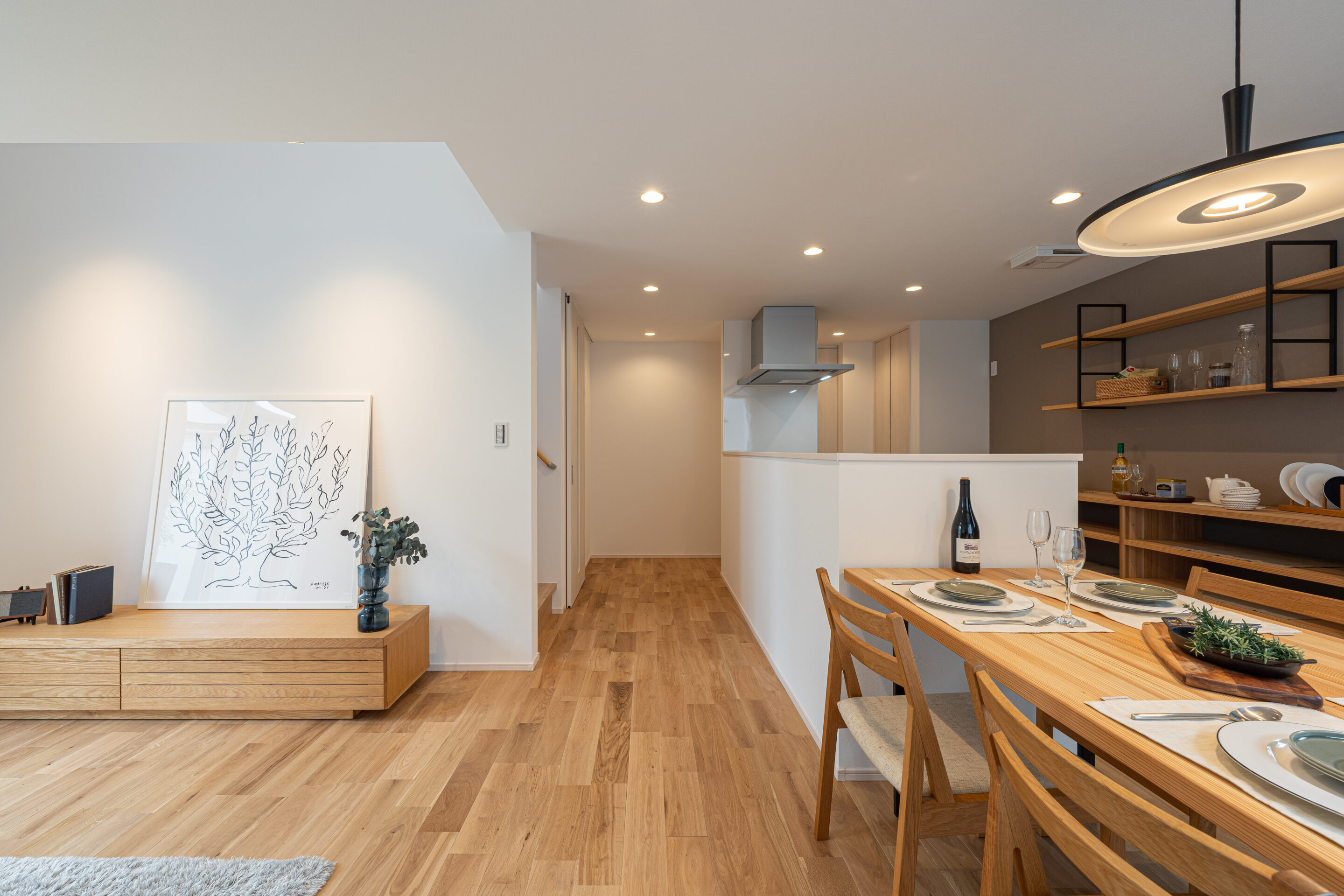 リビング、ダイニング、キッチンを緩やかにつなぐトライアングル配置により、家事をしながらでも家族と会話がしやすい空間を実現しました。