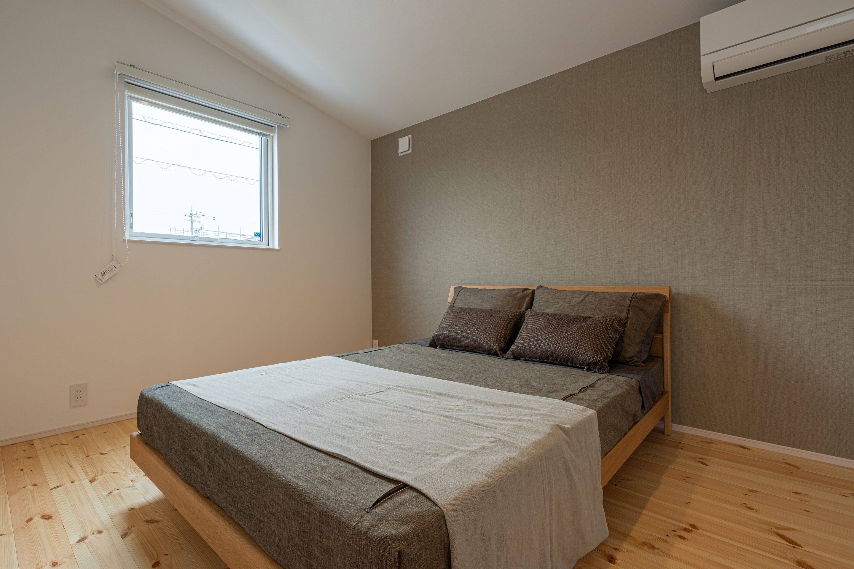 グレーのアクセントクロスと勾配天井で、落ち着いた寝室空間を実現しました。