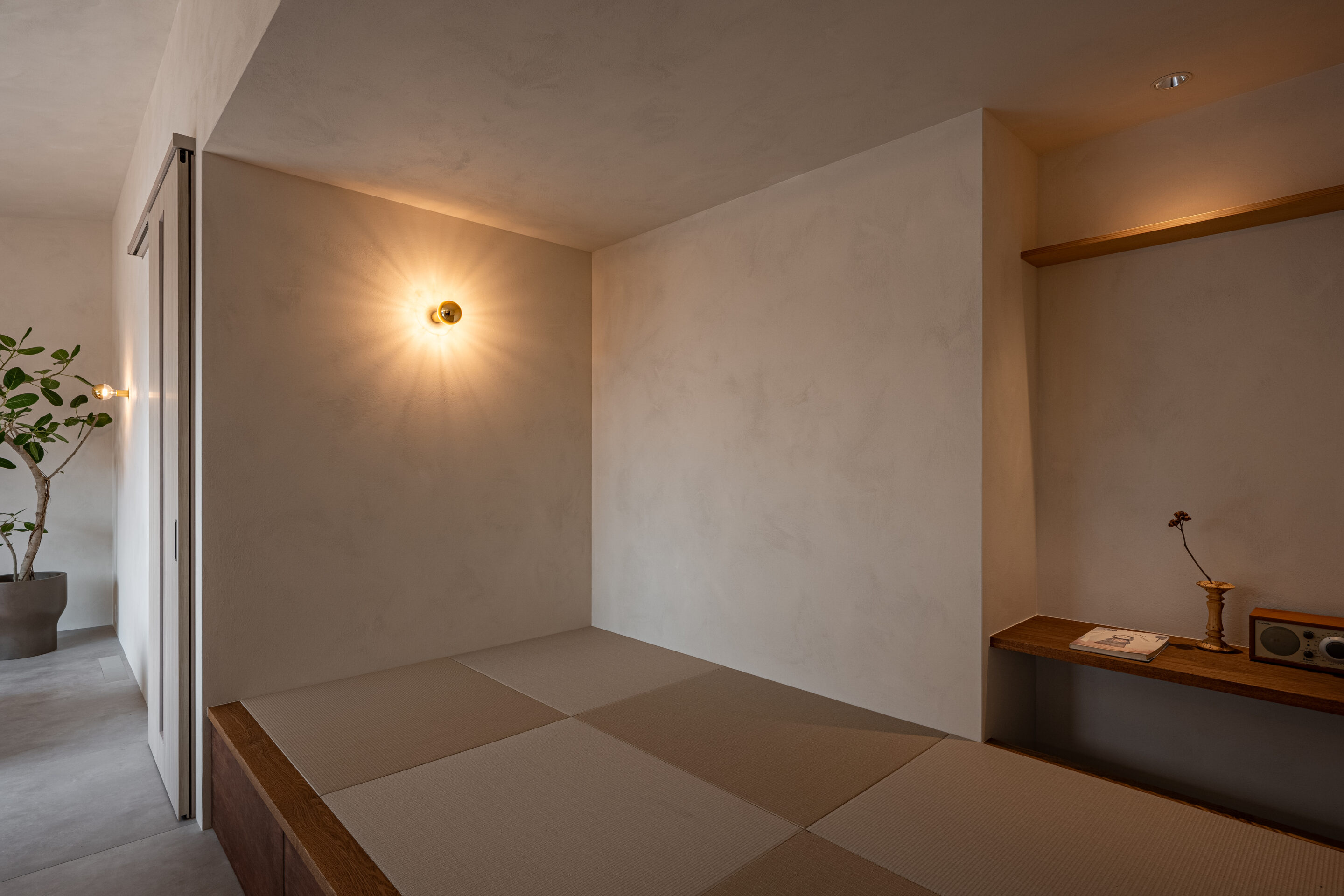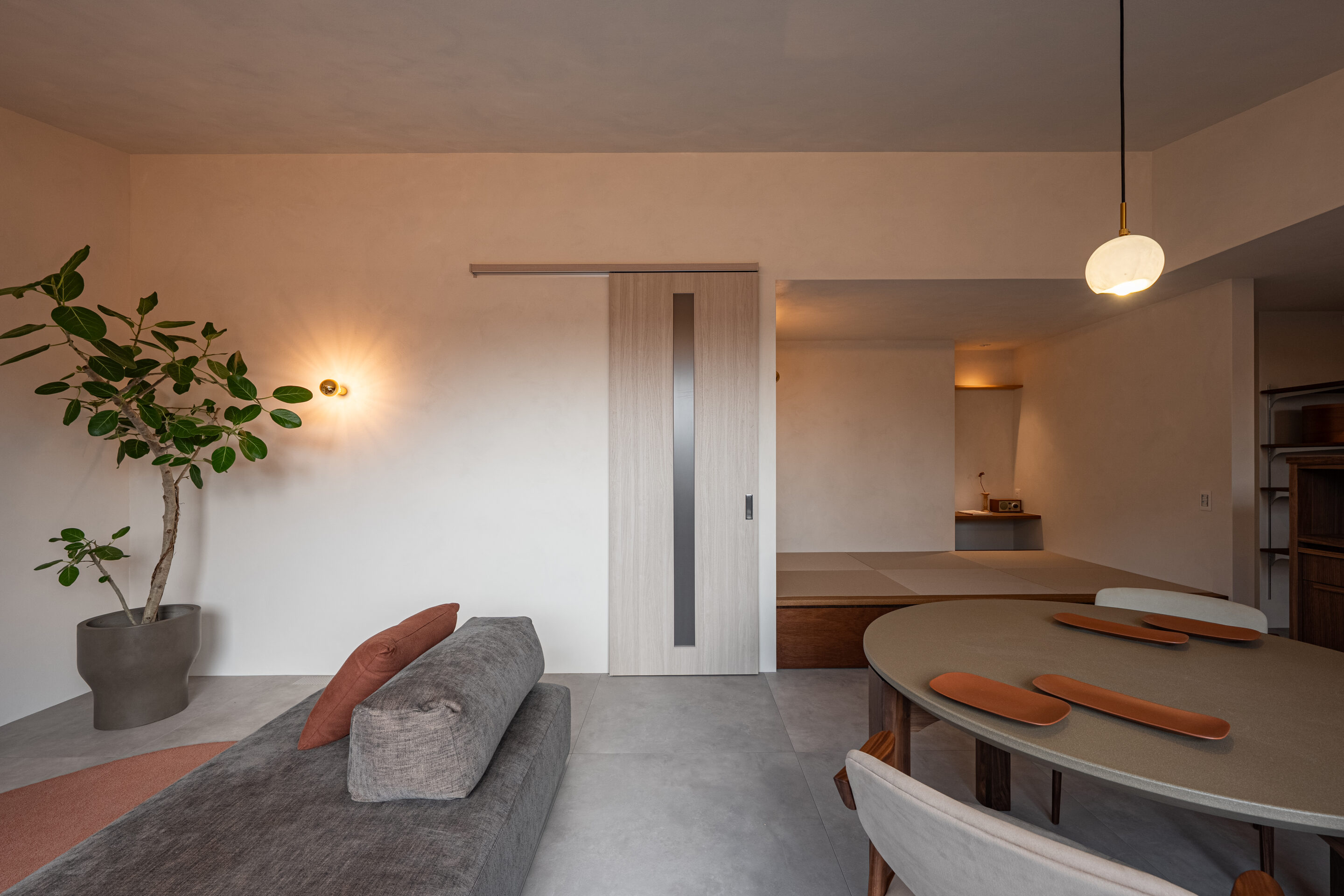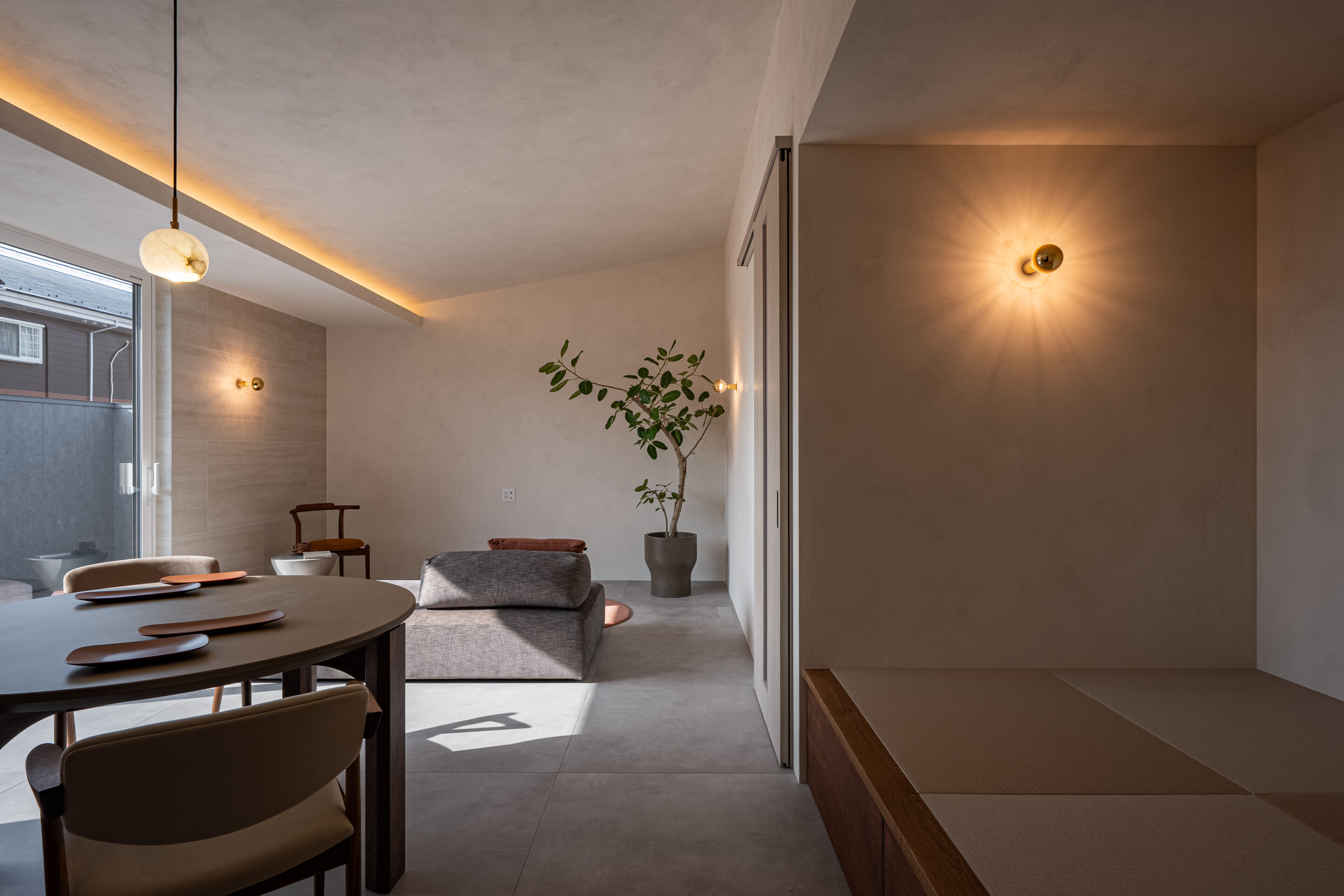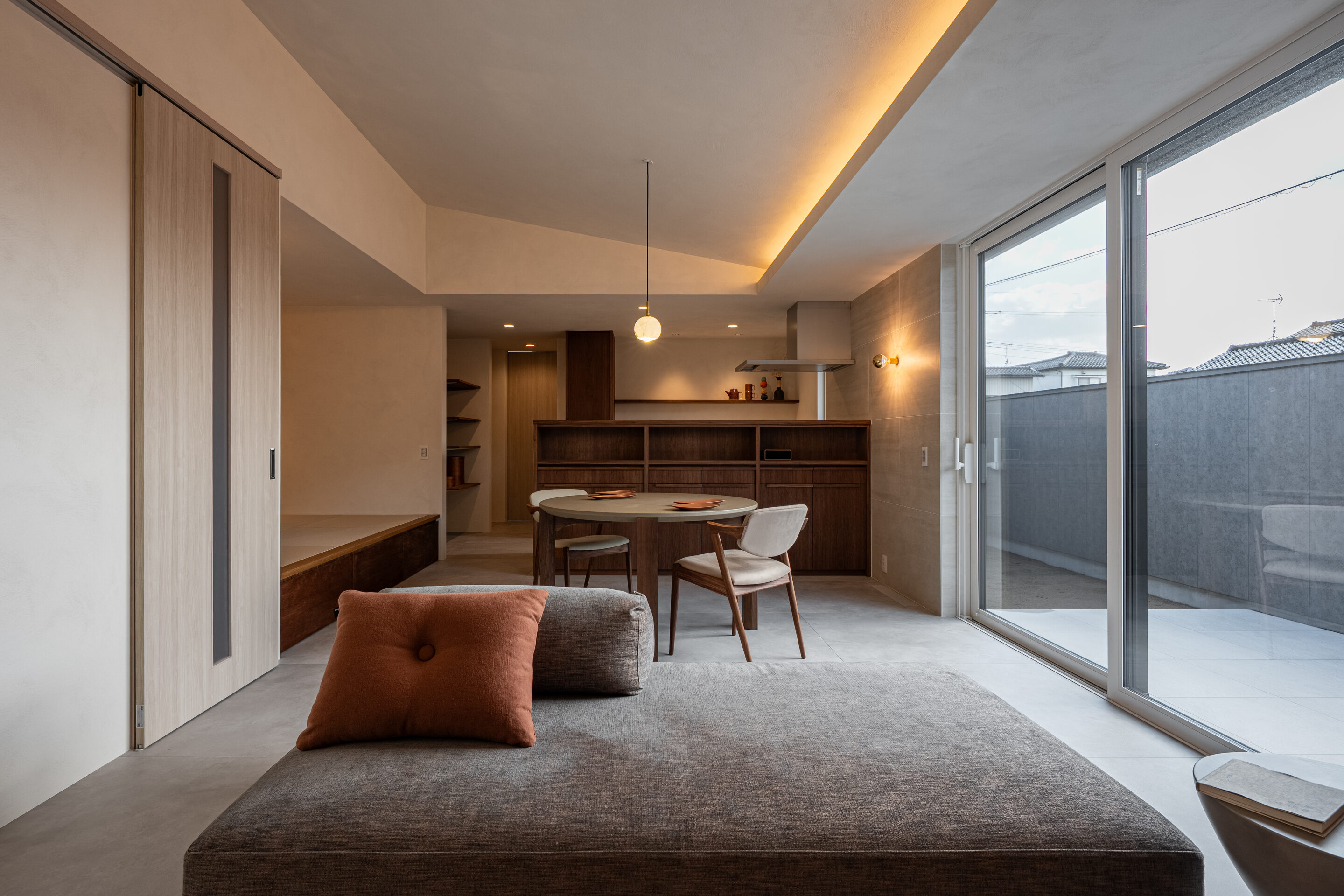 昼は外からの自然光、夜は間接照明が空間を包み込む、心地よいリビング。