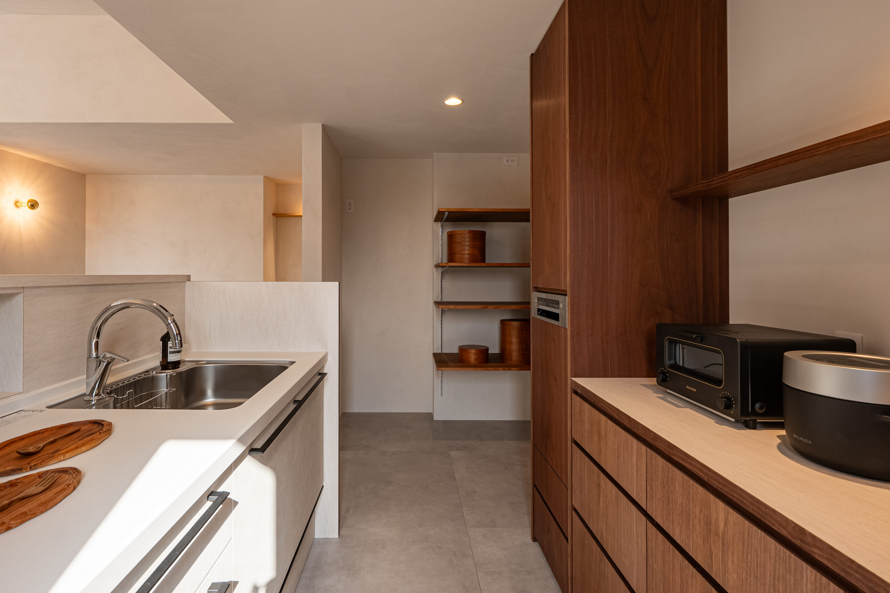 造作のカップボードとパントリーにより、機能性と美しさを両立しています。