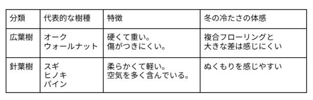 また、先ほど紹介した樹種による違いも、正直なところ広葉樹については、複合フローリングと大差がない体感温度に対し、針葉樹はあたたかさを感じやすいです。