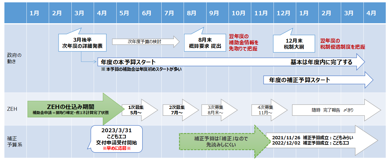 春~夏前ぐらいに住宅会社と検討をすすめて、契約・設計の細かい部分までつめ、確認申請をお盆明け~秋ぐらいに出すことができれば、補正予算の補助金のスケジュールに合致しやすくなります。
